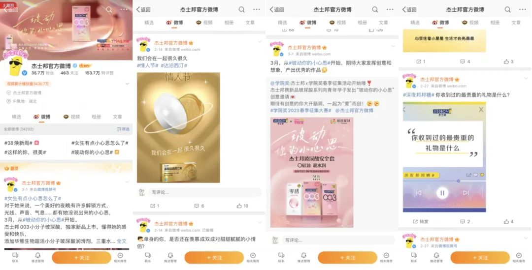 微博:杰士邦在微博有35.7w粉丝,主要内容以话题互动、产品种草、有奖互动为主。