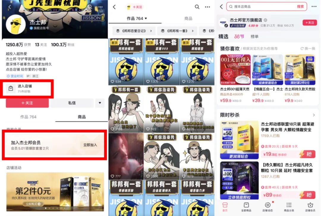 抖音:杰士邦在抖音的主账号名字为【杰士邦】,有100.3w粉丝,账号主要是推广产品、福利介绍、知识分享等内容。