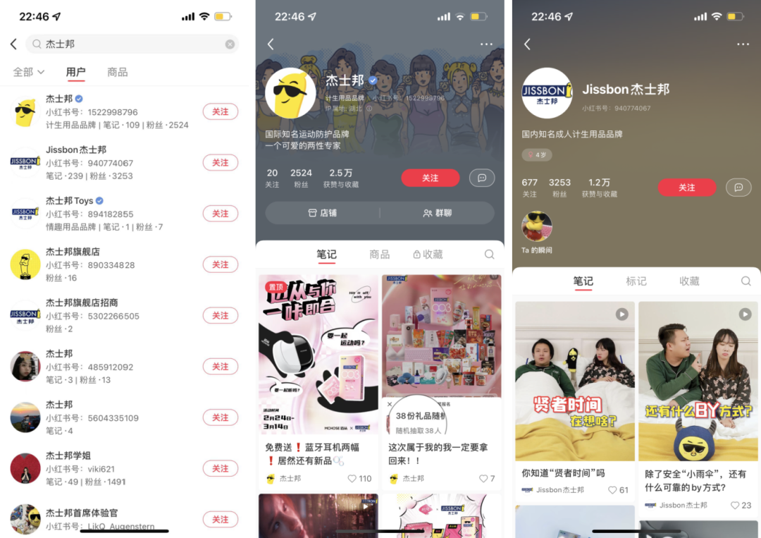 小红书:杰士邦在小红书有两个主要账号「杰士邦」和「Jissbon杰士邦」,总粉丝将近6000,内容以产品种草、活动宣传、知识科普为主。