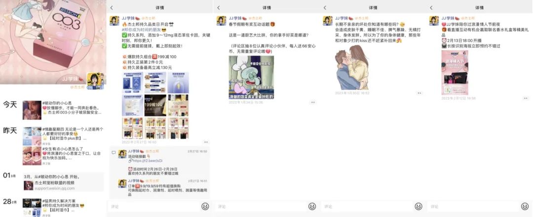 杰士邦社群每日会发布3-5条内容,主要以秒杀活动、互动游戏、社群答疑、拉新好礼为主。