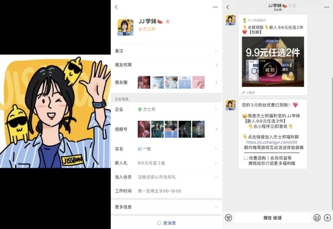 杰士邦目前通过企业微信与用户建立链接,背后所添加的员工IP自然成为展现品牌调性的重要窗口。