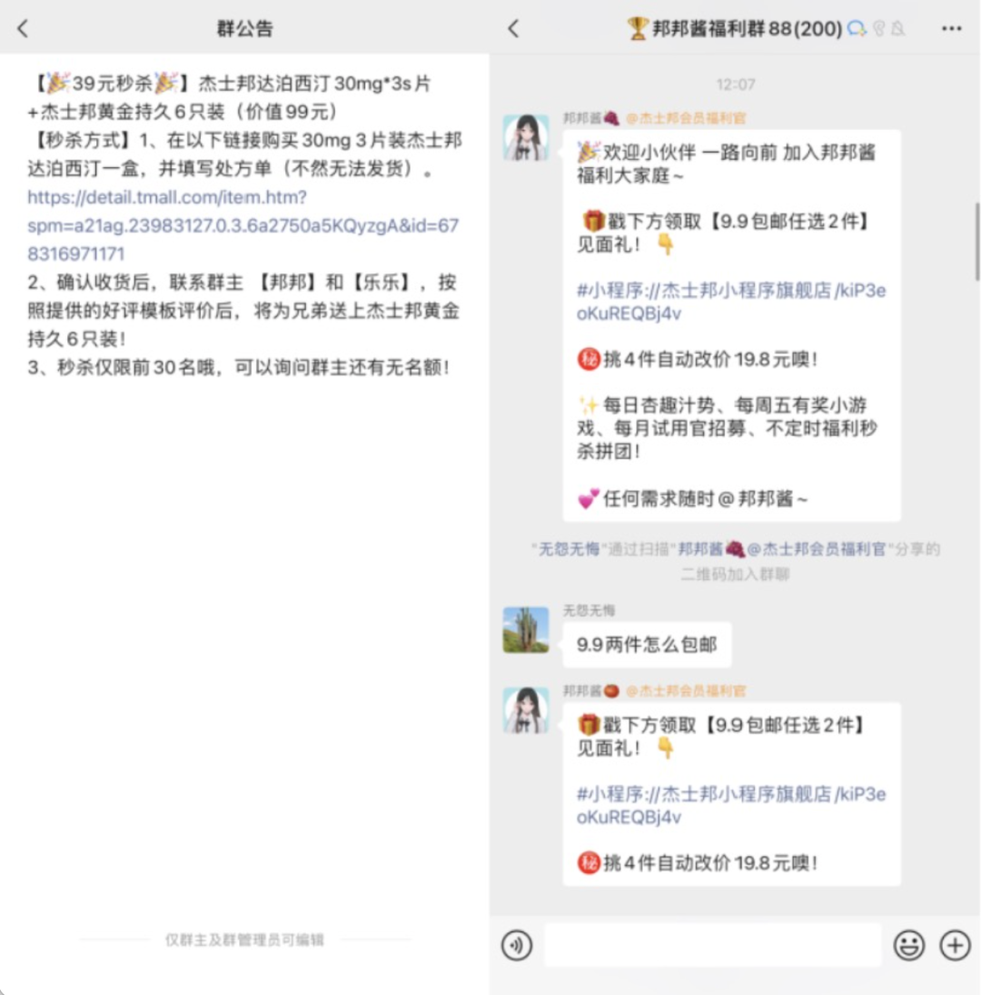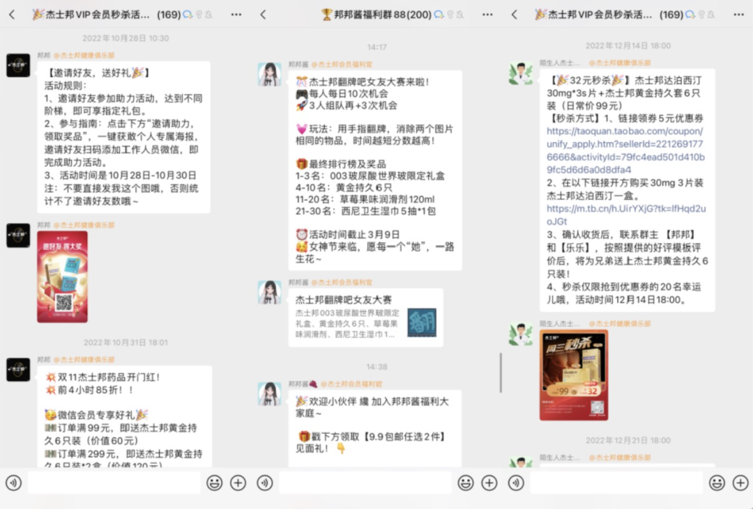 杰士邦的社群运营实现了精细化分层运营,基于不同的用户画像搭建了不同类型的社群,分为日常群、兴趣群、福利群等。