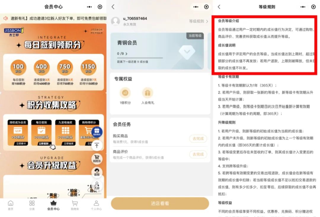 杰士邦在微信小程序和电商平台中设置会员体系+成长体系,福利的内容略微会有不同。