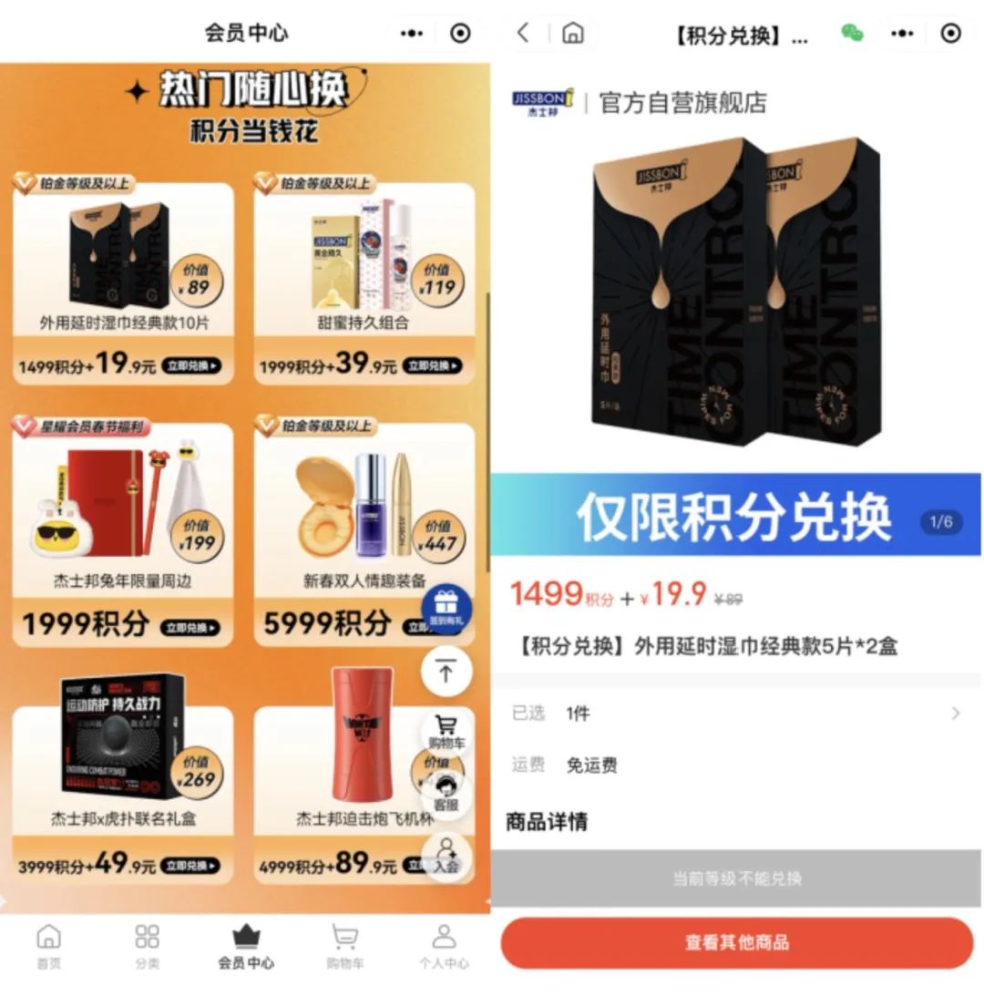 杰士邦的会员体系主要在【杰士邦小程序旗舰店】中承载。