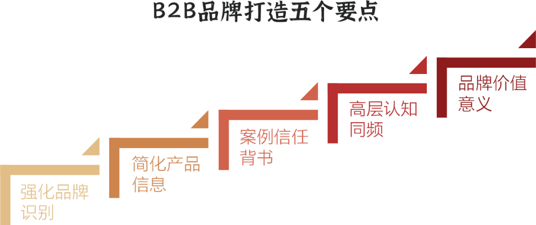 根据以上分析,B2B品牌打造“从企业到顾客心中”的整个过程中,我总结了五个要点,下面详细阐述。