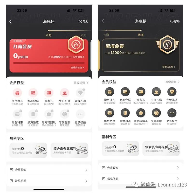 和大多数APP一样,用户留存和复购的解决方案是提供用户成长体系,搭配阶段性的权益套餐,不断提升用户的Ltv,产生更高的复购频次。海底捞的策略路径是:通过多渠道注册---过程中线上线下的消费行为积攒成长值---获得不同等级的会员身份---不同身份享受阶段差异性的权益福利。 在注册环节,海底捞通过打通线上线下注册大数据,用户在线上可通过小程序、APP、公众号等私域阵地注册会员,同时线下可在门店点餐Pad注册会员。其次,会员的成长值来源于会员在线下门店消费获得的捞币(每消费1元,对应1捞币)和奖励成长值(计算周期内单次实付金额超过100元的次数*100)的总和,成长值越高,对应的会员等级也越高。海底捞把所有注册会员区分为四个等级,分别是红海会员、银海会员、金海会员以及黑海会员。