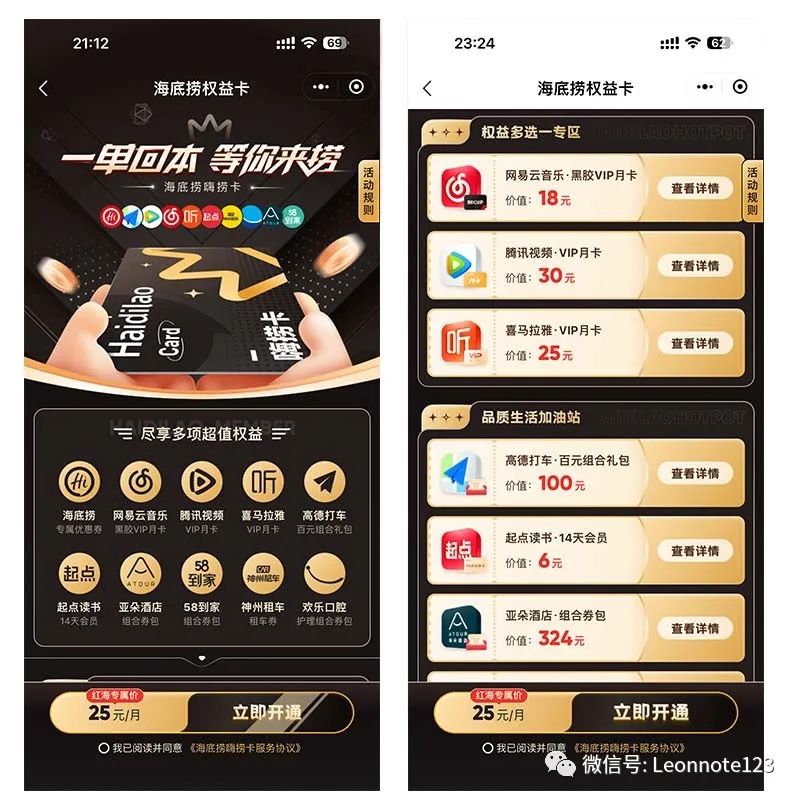从用户生命周期的角度来看,当用户有了足够多的蓄水池,且线上也搭建完善了留存手段,下一步应该增加付费点,提升用户消费复购率。海底捞的做法是付费权益。付费权益也是常见的会员运营策略,用户通过付费解锁相关的服务权益。 一单回本嗨捞卡,是海底捞券权益升级卡,注册会员通过在小程序、APP内权益卡可直达嗨捞卡购买页面。嗨捞卡权益分为“海底捞专属券包”、“品质生活加油站”、“权益多选一专区”三部分,其中“海底捞专属券包”包含价值95元的海底捞组合券包;“品质生活加油站”包含高德打车、起点读书、欢乐口腔、58到家、神州租车及亚朵酒店等组合券包;“权益多选一专区”内可选内容包含喜马拉雅VIP月卡、腾讯视频VIP月卡及网易云音乐黑胶VIP月卡,购买嗨捞卡后有效期内可任选其一领取,剩余两项权益可分别于嗨捞卡有效期内于海底捞店内堂食消费累计 2次后和累计3次后解锁领取。嗨捞卡红海会员的价格是每月25元,对于权益价值而言,是一次性价比极高的付费体验。