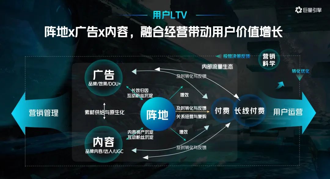 其核心是围绕游戏行业的用户规模与LTV两个目标,聚焦游戏企业持续经营的三个场域:广告、内容、阵地,针对不同阶段,组合运用不同手段,最终激发行业用户的长期价值。