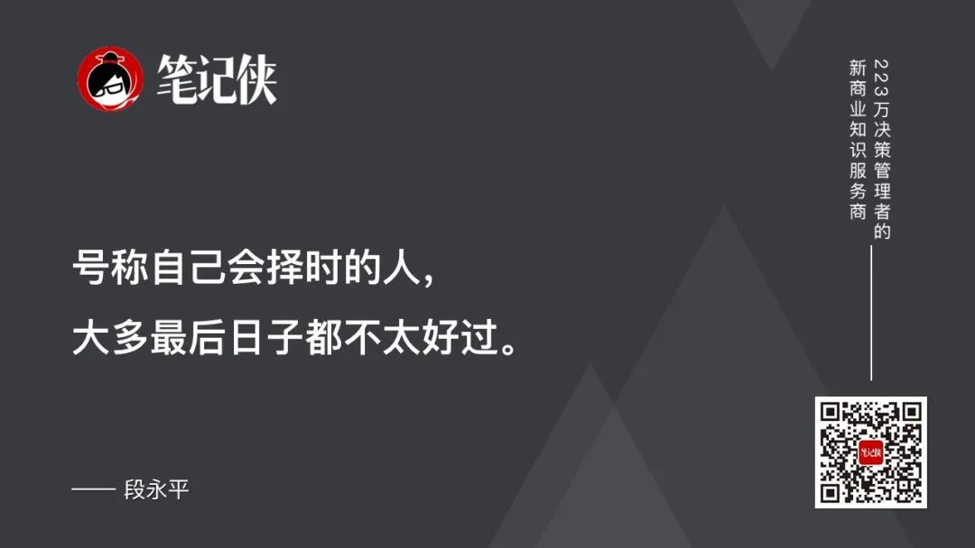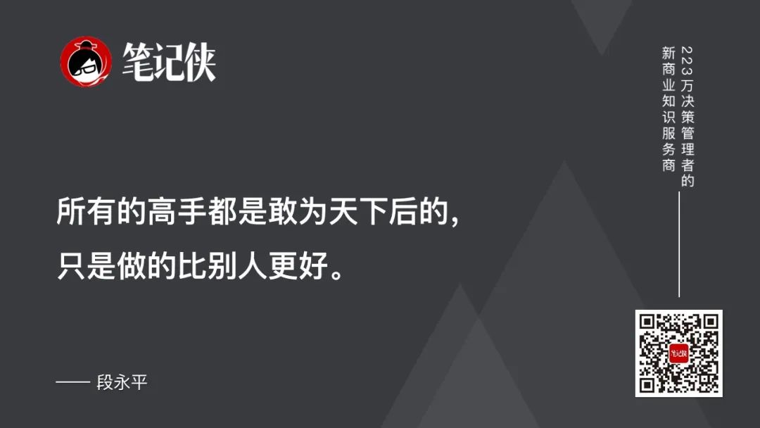 12.敢为天下后,指的是产品类别,是因为你猜市场的需求往往很难,但是别人已经把需求明确了,你去满足这个需求,就更确定。(敢为天下后指的是“做对的事情”,后中争先指的是“把事情做对”的能力。)
