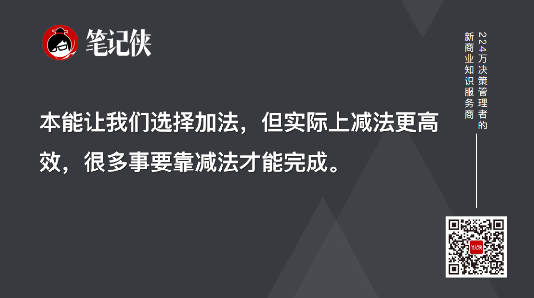 本能会让我们选择加法,因为人喜欢多不喜欢少,喜欢获得不喜欢失去。但实际上减法更高效,很多事要靠减法才能完成。