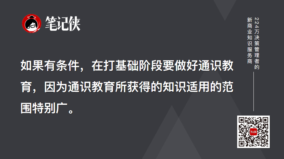 相比之下,如果在大学学习的是某一个专业特定的技能,换一个专业几乎就要从头做起。这也是我一直强调的,如果有条件,在打基础阶段要做好通识教育,因为通识教育所获得的知识适用的范围特别广。