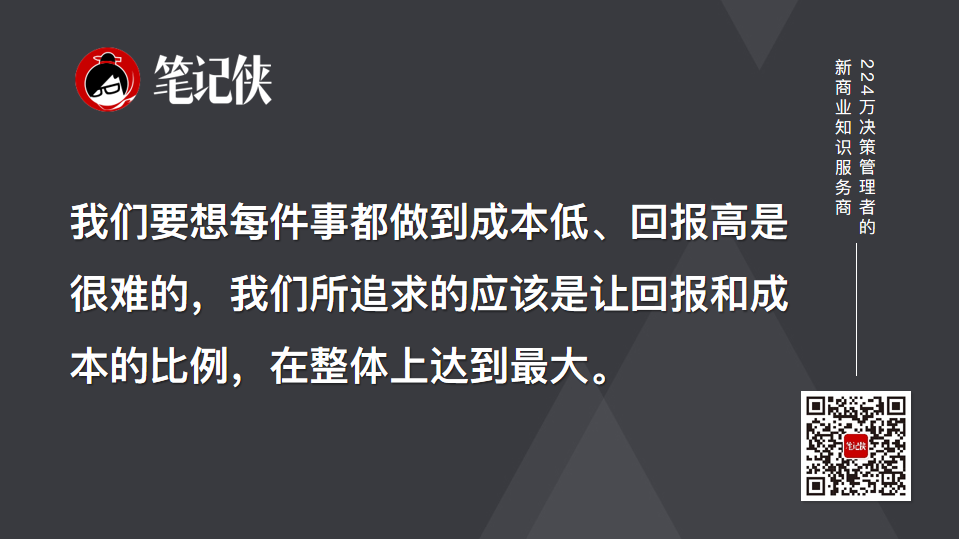 我们要想每件事都做到成本低、回报高是很难的,我们所追求的应该是让回报和成本的比例,在整体上达到最大。