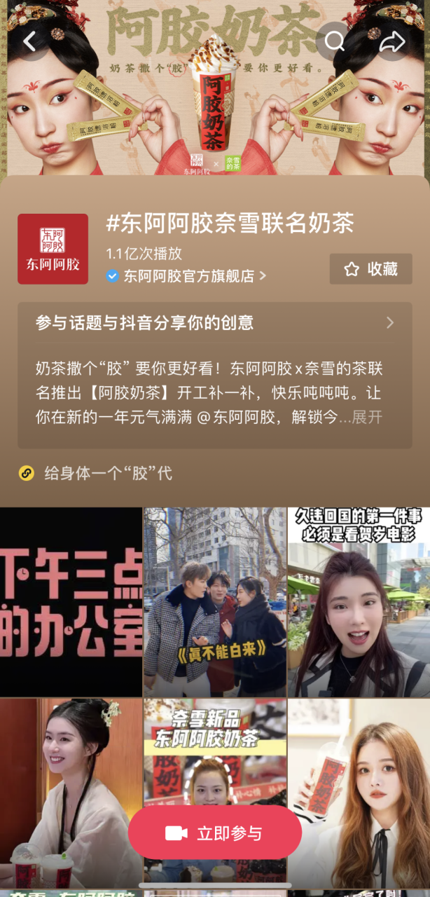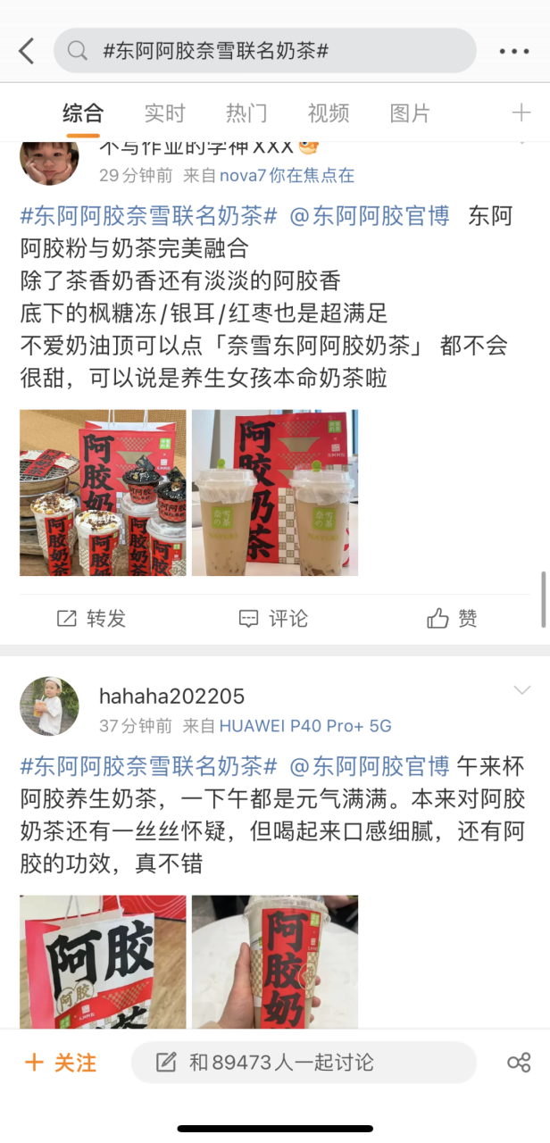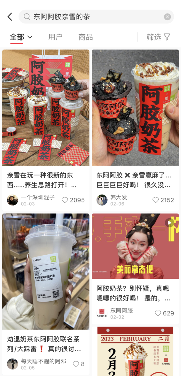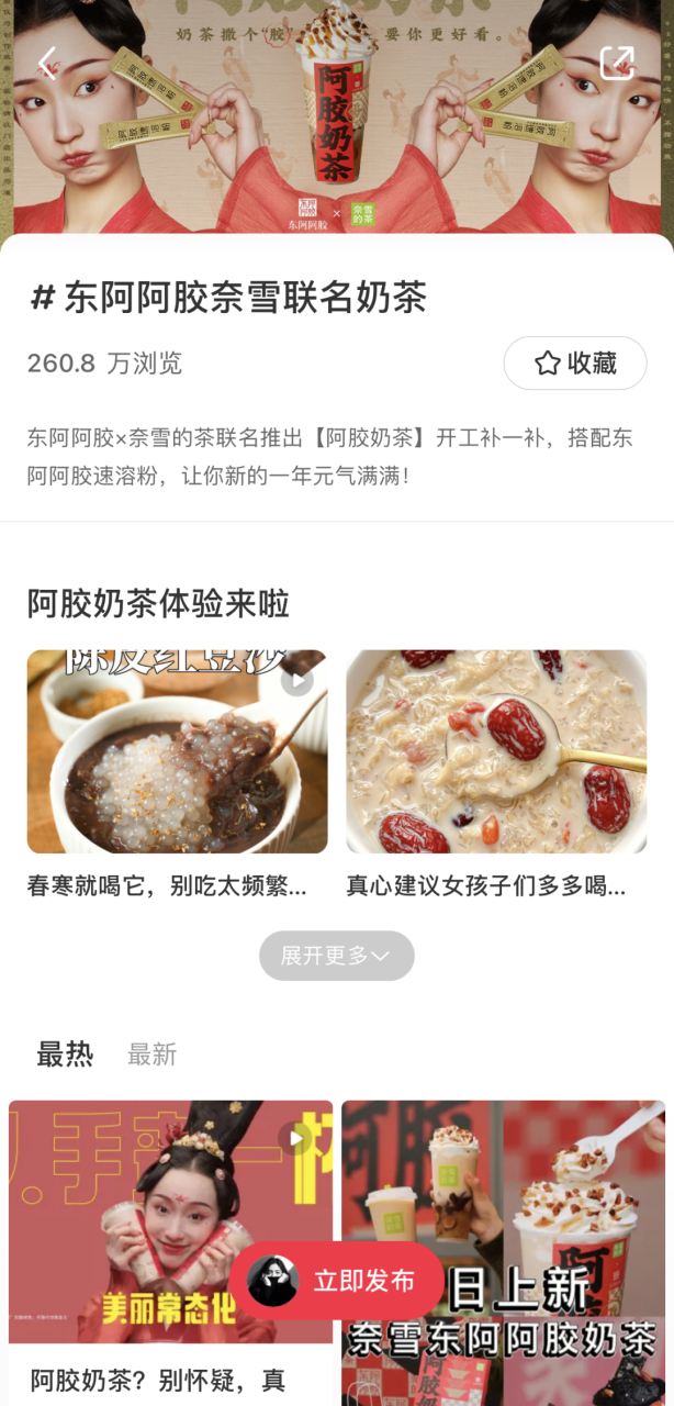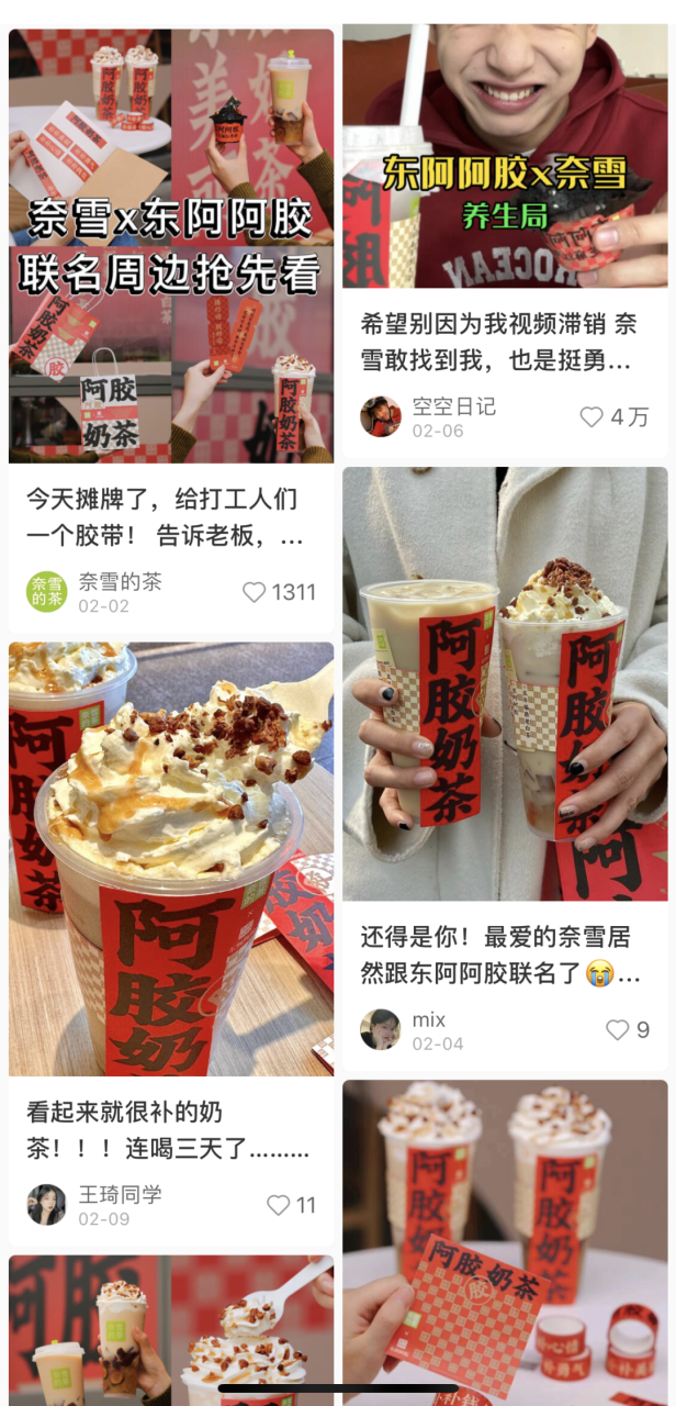 用户自发的UGC内容让此次联名破圈传播,掀起国民养生热潮。上线当天,#东阿阿胶奈雪联名奶茶话题破2亿,#梦中情奶#、#元气美女都在喝#、#看起来就很补的奶茶#…等话题让联名新品口碑不断发酵,热度急速攀升,目前成为奈雪的茶销量TOP1。