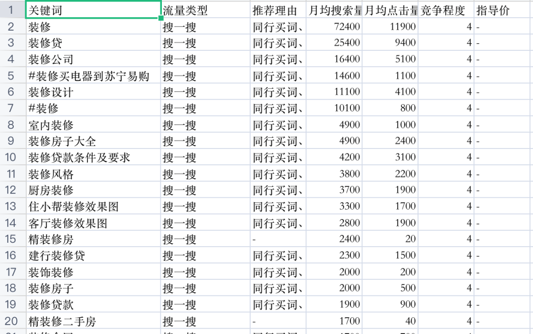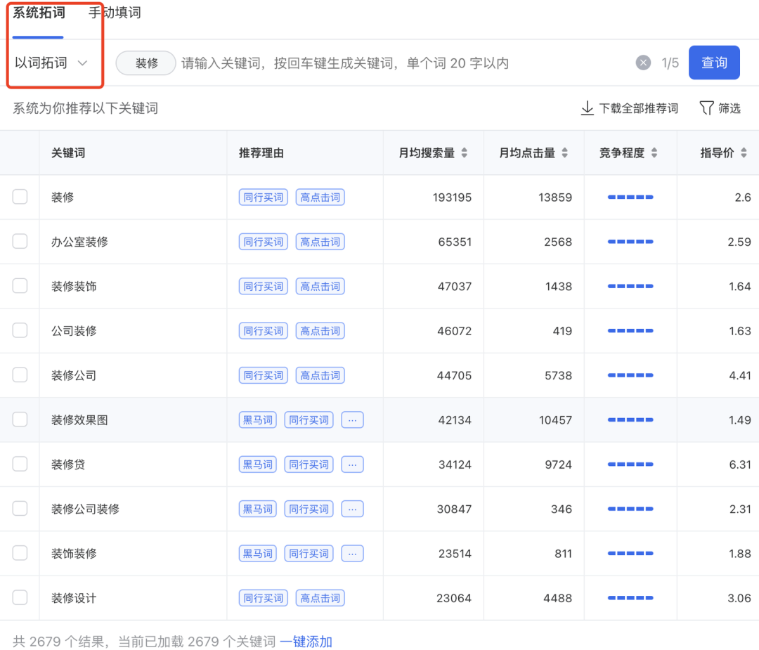 如果之前没有投过搜索广告,有两种方式可以选词:一是通过“腾讯广告投放平台-工具-关键词工具”,然后提交行业种子词,比如我输入“装修”,系统就会自动进行拓展关键词: