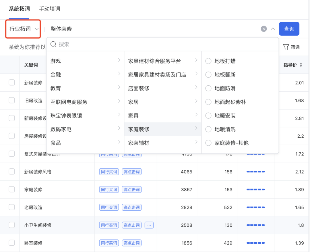 另一种方式是在搭建广告计划时,使用「系统拓词」功能,包括「以词拓词」和「行业拓词」两种方式。