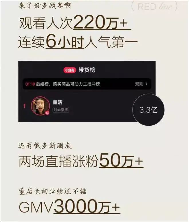 董洁自1月13日2场直播之后,涨粉将近50万,如今的GMV已高达3000万,直播间观看人次220万+,连续6个小时冲榜人气榜单TOP1,估计董洁自己都想不到2场直播会带来这样高的GMV吧。