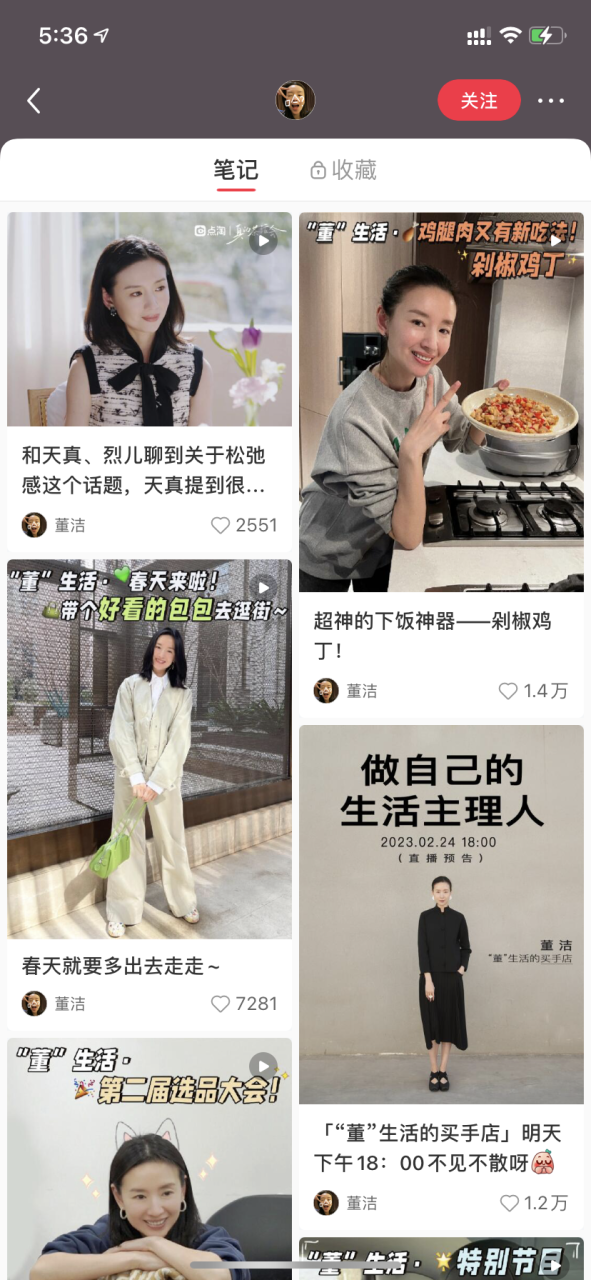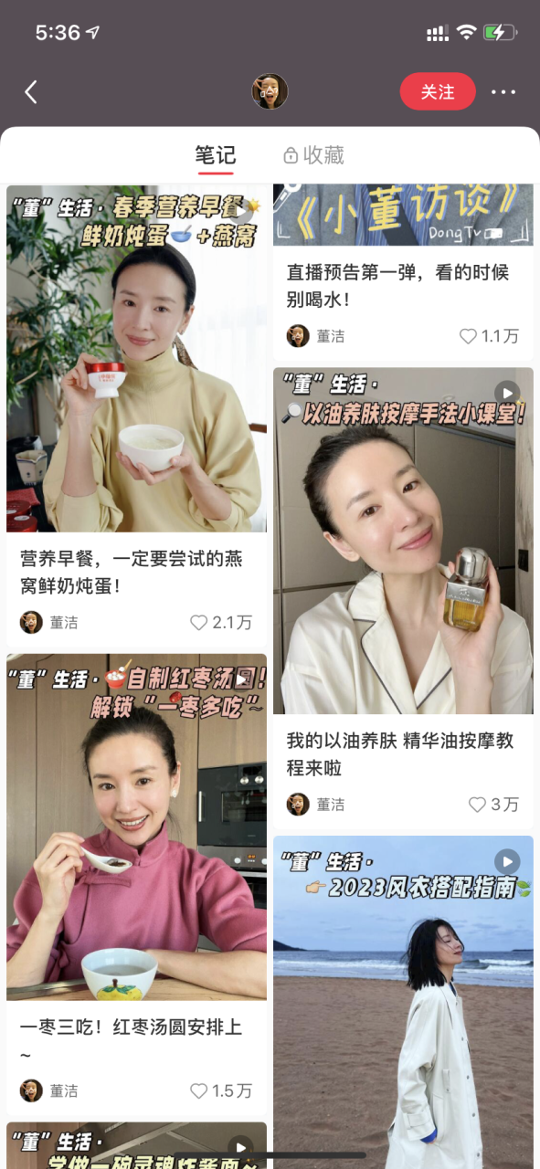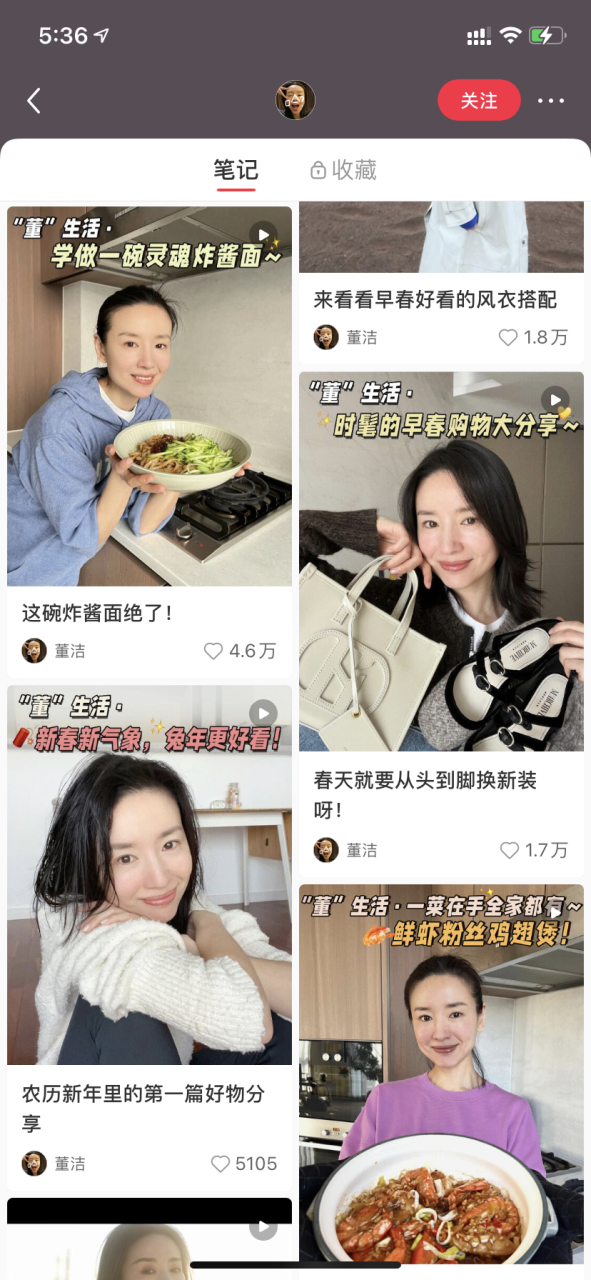 从董洁的小红书账号中,素颜、短发、简单穿搭、美食是她日常展现在用户面前的她,真实又接地气,用户在刷到她时,甚至不会想到她是位明星,瞬间拉近了与用户之间的距离感。