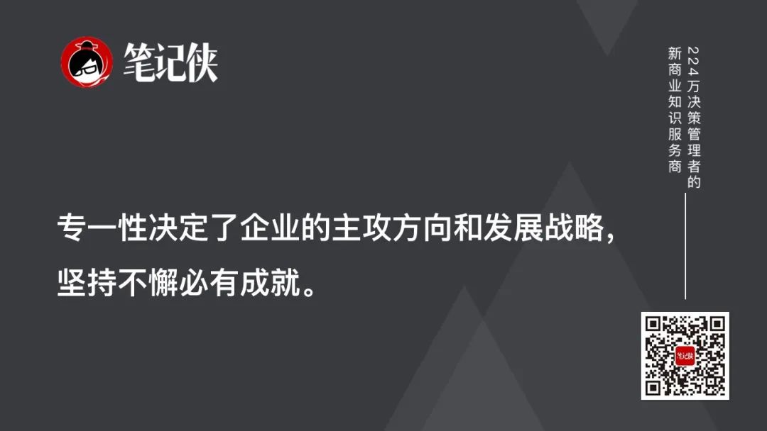 8.专一并不等同于「单一」,而是指企业在某一领域具有深度挖掘和扩展产品或服务的能力。专一性决定了企业的主攻方向和发展战略,坚持不懈必有成就。