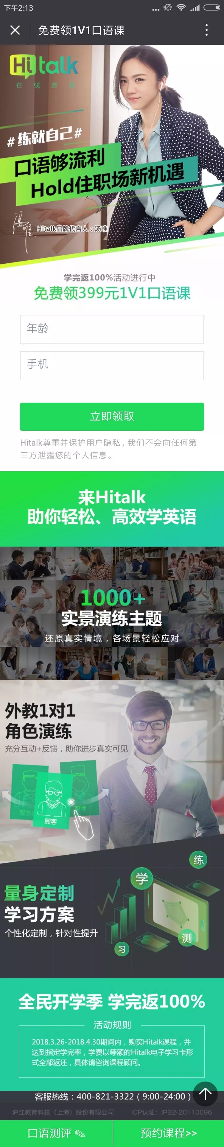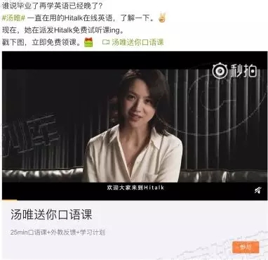 汤唯本身是很励志的一个人物,配合她个人的留学经历,会更加吸引用户转化。同时仍旧是以免费领取399元1对1口语课这样一个噱头,来吸引留资。
