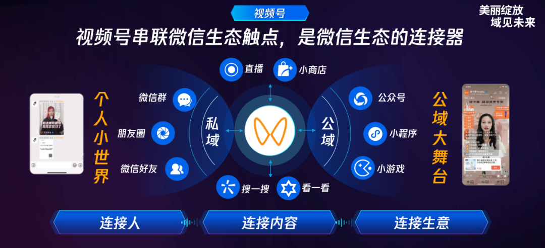 比方说,视频号+搜一搜=构建品牌与用户的桥梁、视频号+朋友圈=公私域社交沟通阵地、视频号+企业微信=1v1深度沟通工具、视频号+小店=一战助攻生意转化...在庞大的生态微信中,视频号就像一个能串联万物的“连接器”——它不仅能将生态类的组件连接起来,也能将用户个人小世界和公域大舞台连接起来,并在连接人、内容、生意的同时,进一步助力美妆品牌去激活自己的全域经营价值。