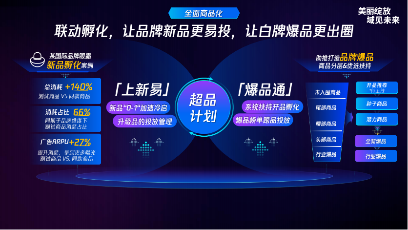 一是在政策上扶持。腾讯广告超品计划针对品牌新品和潜力爆品推出了“上新易”和“爆品通”产品,通过让品牌新品更易投,让白牌爆品更出圈的“超品计划联动孵化”,去加速新品从“0-1”的冷启动、用爆品榜单跟品投放去全面种草,让新品和爆品“有迹可循”。