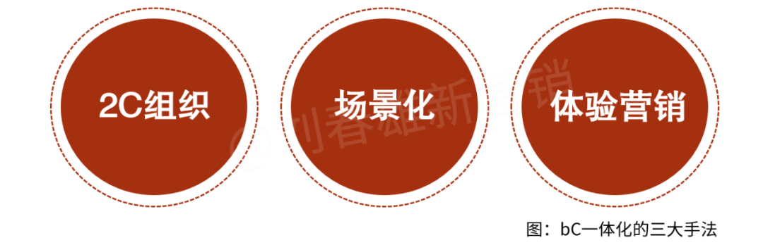 bC一体化的三大手法是2C组织、场景化、体验营销。触达C端是关键。