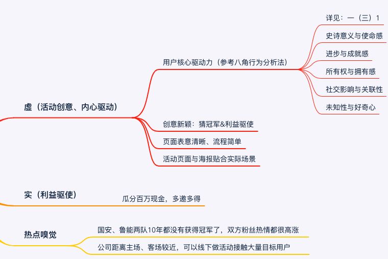 【总结】:通过用户行为模型分析和用户心理动机因素分析,这件事情有史诗意义、成就感、所有权、社交影响、未知性等诸多心理动机可以触发,可以从影响因素最大的动机”所有权与拥有感“做深入分析,外加上还可以瓜分奖金,有趣、有料、有钱,所以这个活动是值得做的。