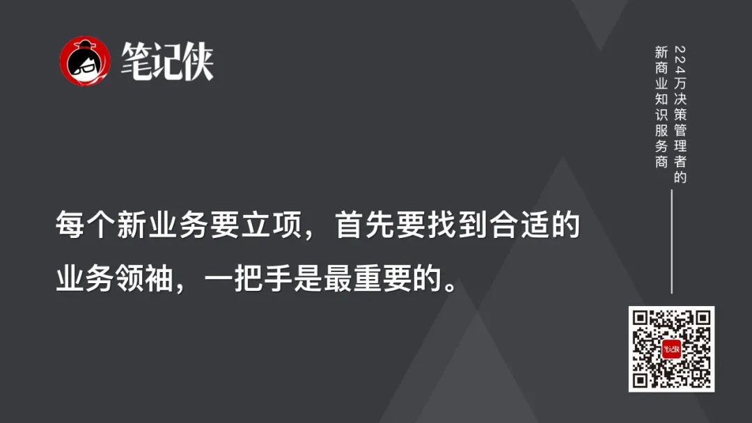每个新业务要立项,首先要找到合适的业务领袖,一把手是最重要的。