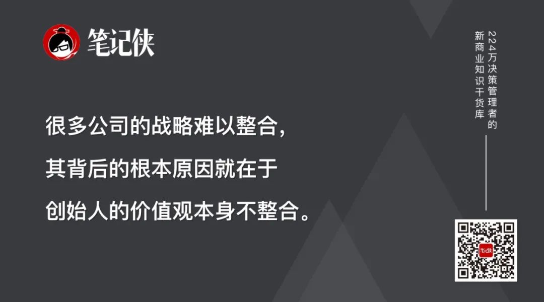 创始人内在价值观相互打架的话,在公司战略层面的体现就是“名义战略”与“实际战略”形成两层皮(比如名义使命上说是要给客户提供优质的产品,实际的战略上就只是在追求“大”)。