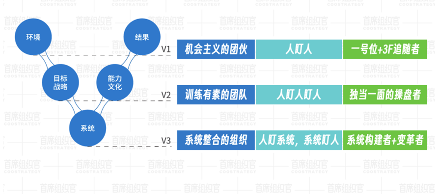 V模型的三层次,可以从组织视角解释一个公司的发展规律,描绘了一个企业从“人盯人”转变为“人盯人盯人”,升级为“人盯系统系统盯人”,揭示了一个企业如何从机会主义的团伙,蜕变为训练有素的团队,进化为系统整合的组织。