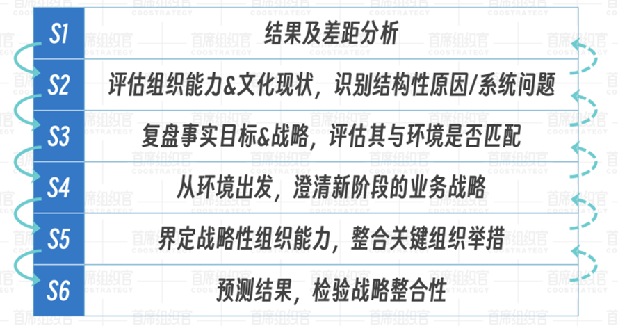 前三步(上图所示的S1-3)聚焦于“战略-组织协同复盘”,是站在今天看过去,发现实际存在的问题;