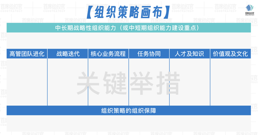 第五步,高管团队要生成一个重要的产出物——围绕“中长期战略性组织能力/中短期组织能力建设的重点”,来制定出“整合性的关键组织举措”。这些会通过一张“组织策略画布”来结构性呈现。