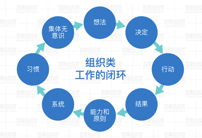 组织类的工作,往往需要从想法,到决定,到行动,到结果,到能力/原则,到系统,到习惯,到集体无意识,再到新想法,这就是组织类工作最全面的闭环。