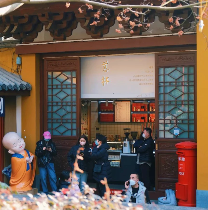 西式的咖啡与东方禅文化碰撞,就像当下互联网流行的电子木鱼、赛博拜佛一样,形成了强烈的反差感,吸引无数好奇的年轻人前去打卡。