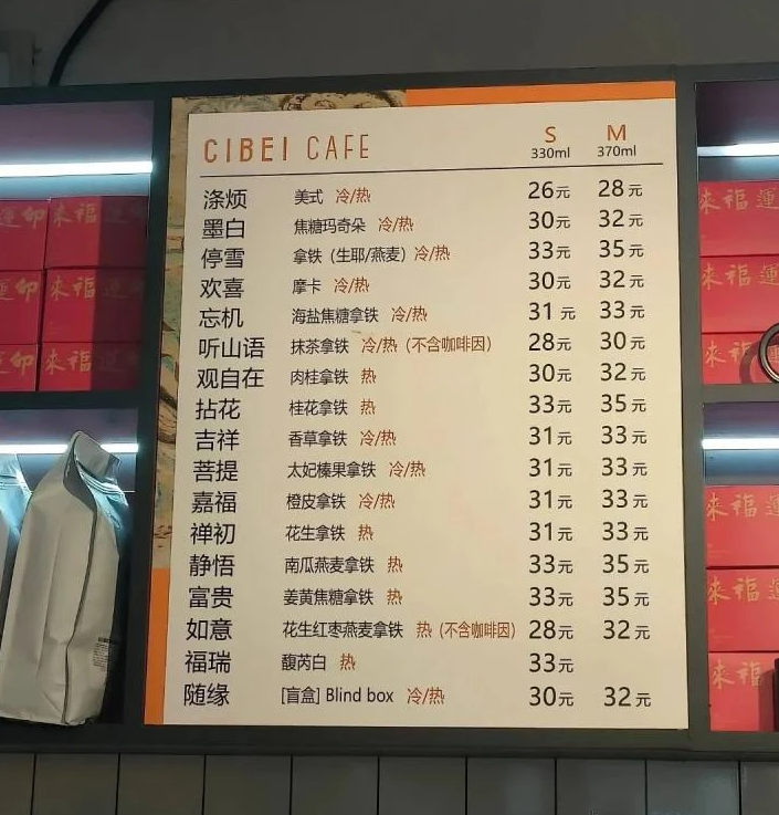 以慈杯咖啡为例,它推出了一款特别饮品叫做“随缘”,一杯30元,随机抽签,抽到啥喝啥,一切随缘。将寺庙传统的“抽签”和当下最流行的“盲盒”巧妙地结合在了一起。