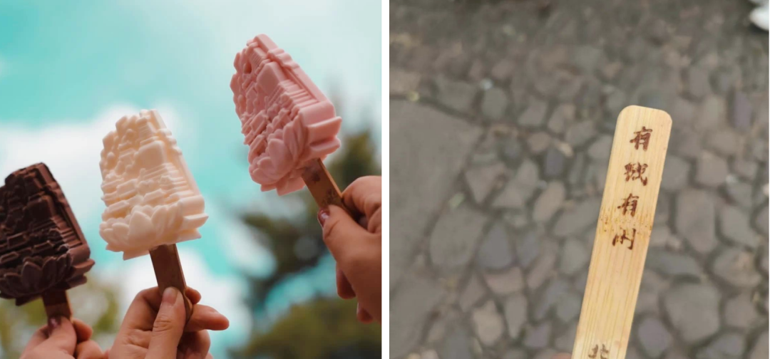 更令人惊喜的是,吃掉雪糕后展露出的雪糕签,是一根带有美好祝福语的祈福签,更是将寺庙的禅意价值具象化。