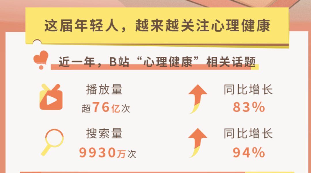 据《2022 bilibili青年心理健康报告》显示,B站内心理健康相关视频播放量超76亿次,同比增长83%, “焦虑”、“抑郁”、“压力”等心理相关词汇搜索量达9930万。