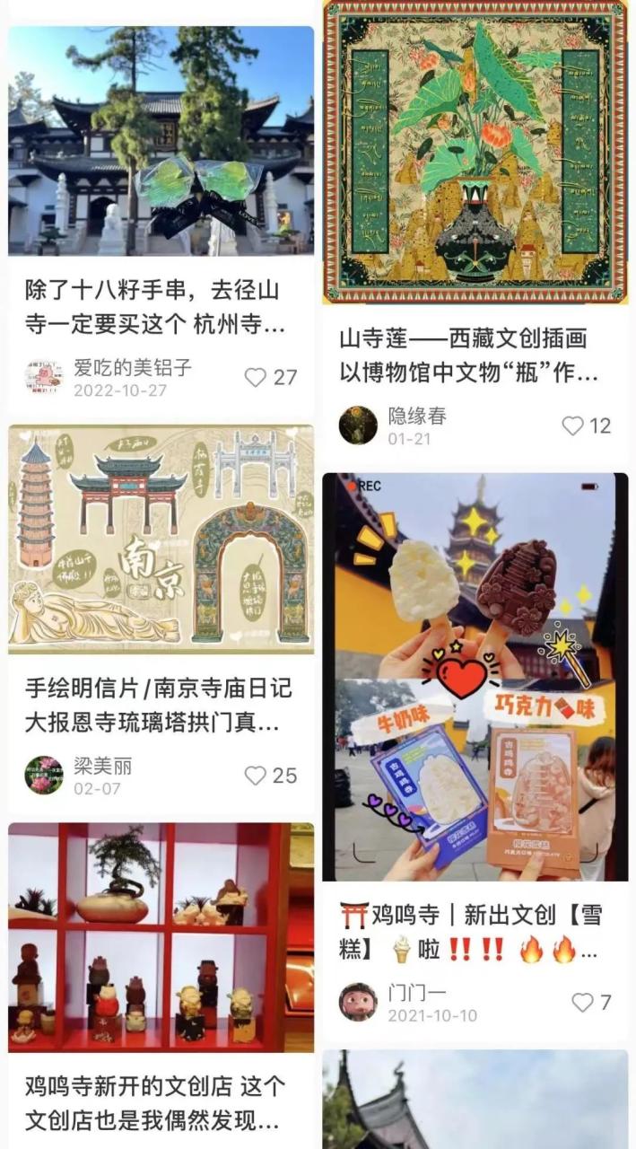 在小红书上,有关寺庙旅游攻略、拍照打卡、文创种草的内容层出不穷,并且许多帖子的点赞数和互动量很高。