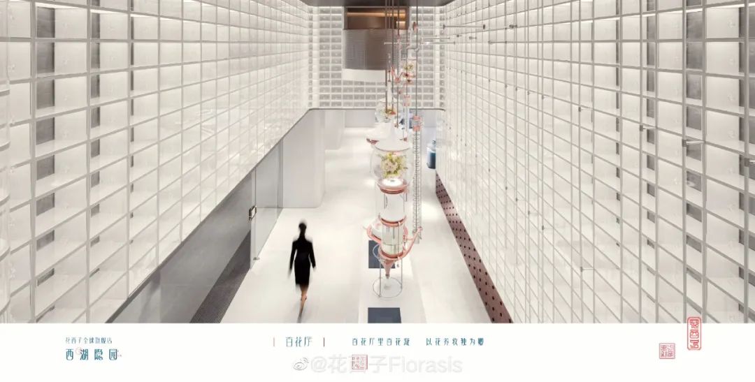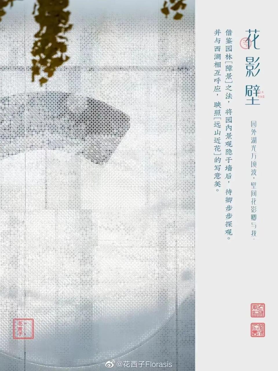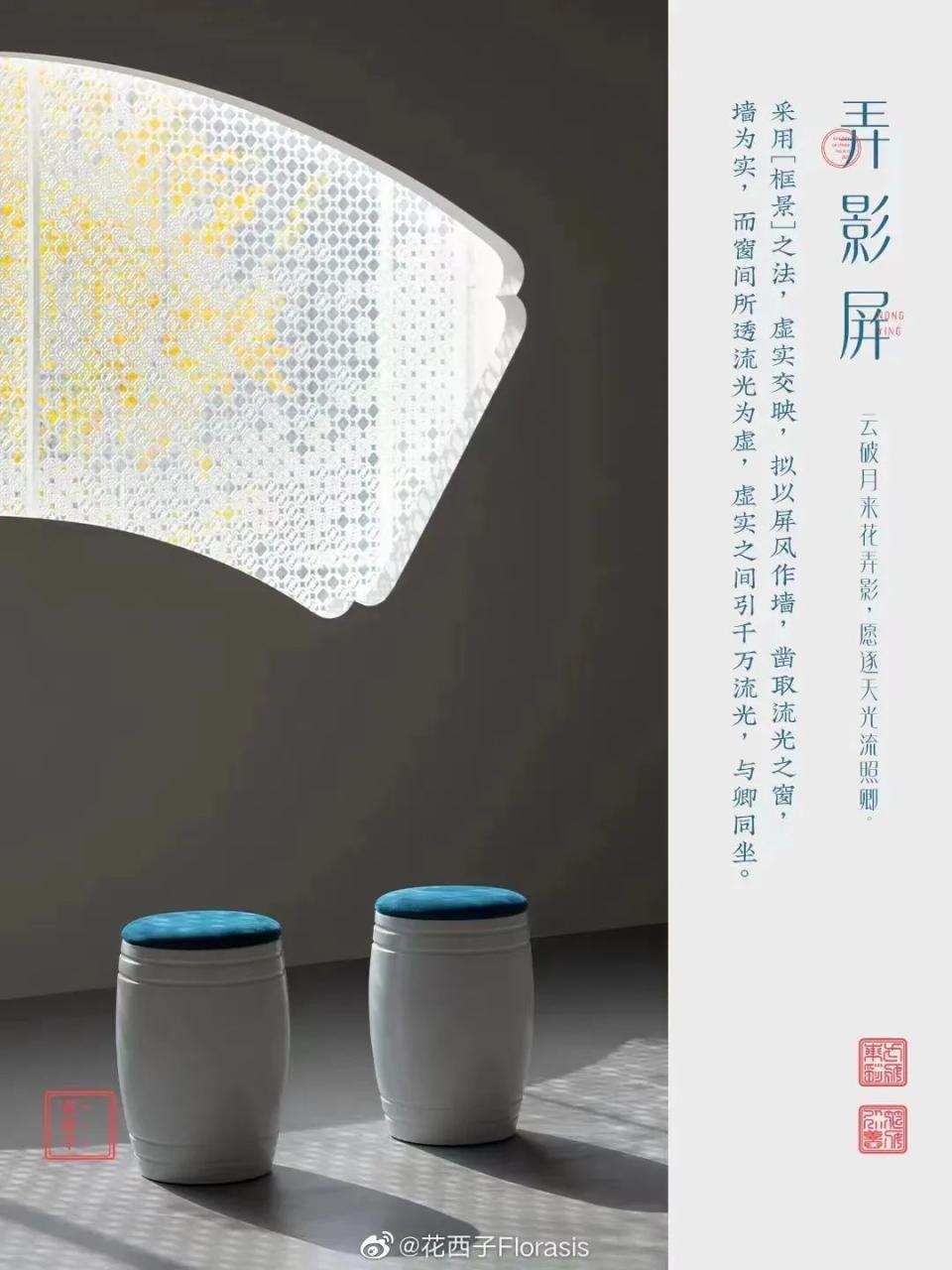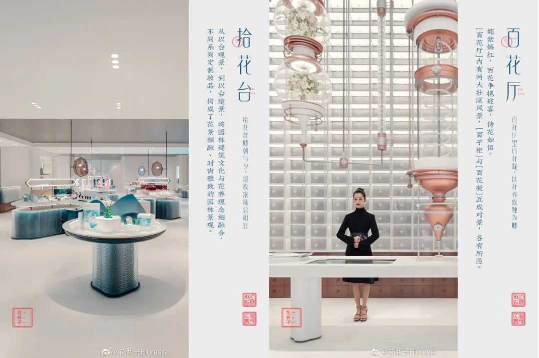 来源于”曲径“的弧形阶梯走廊;采用框景手法的“侯月窗”;借景手法打造的“弄影屏”;障景之法打造的“花影壁”…诸如此类,在中国园林障景、框景、对景、藏景等造景手法的运用下,花西子的极致东方浪漫也得以凸显。