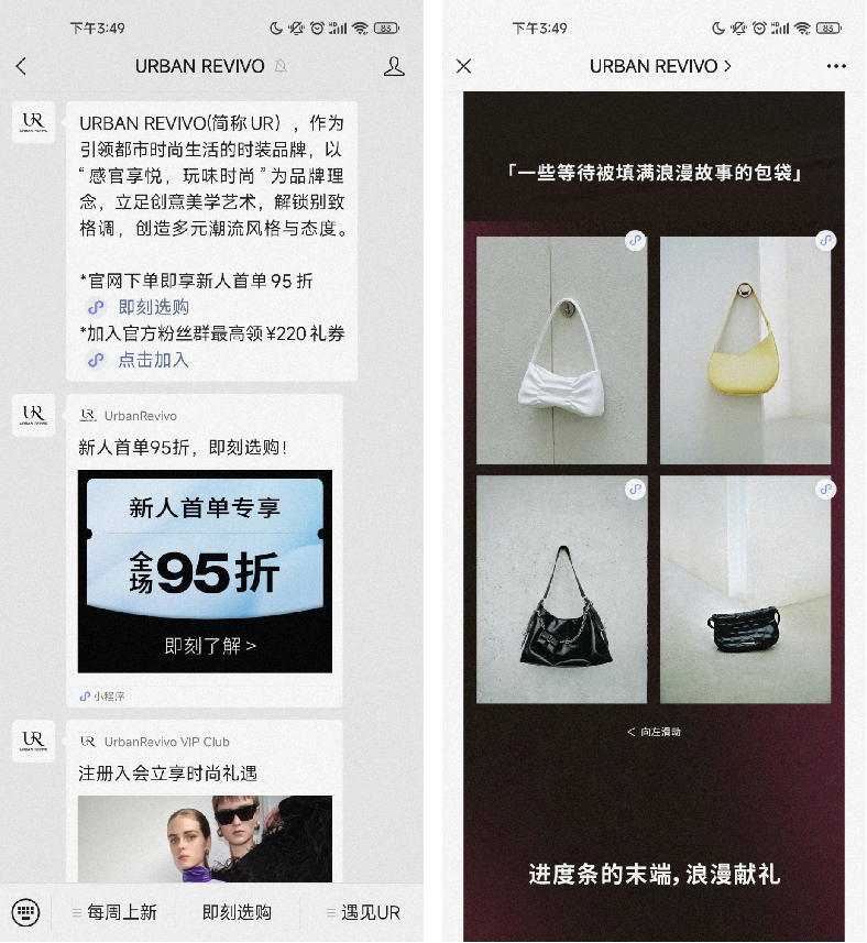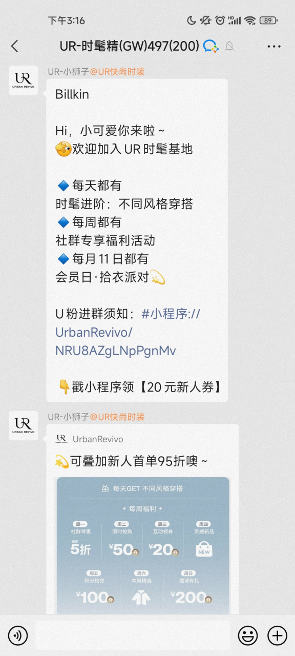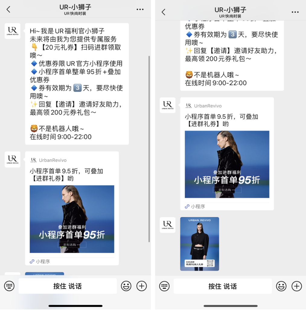 路径①自动欢迎语:新用户关注公众号「UrbanRevivo」即收到自动欢迎语,针对新用户推出新人首单95折优惠,利用折扣福利,如无门槛20元优惠券等吸引用户加入官方福利社群。