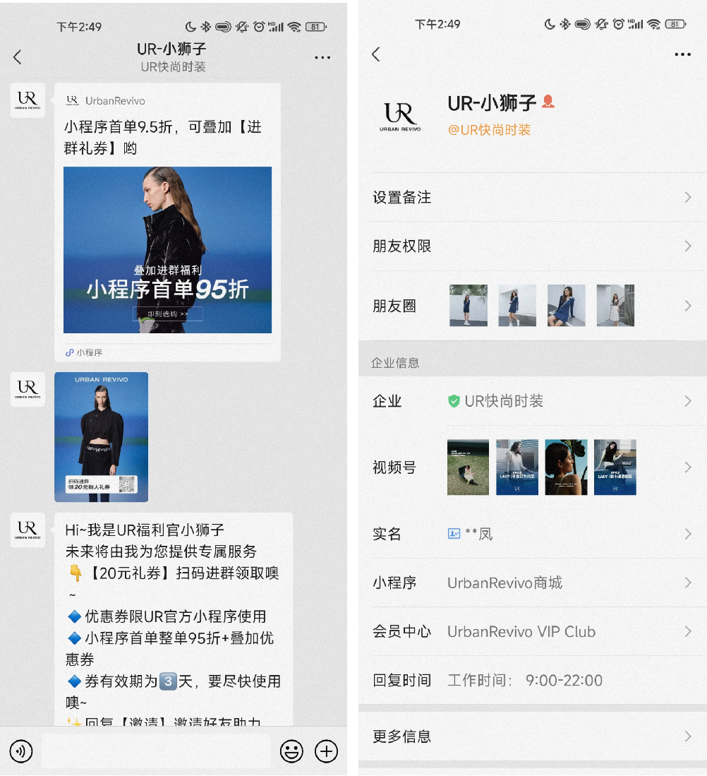 UR通过企业微信建立与用户建立私域内对链接,对每个员工的企业微信都做了统一的对外形象输出,以我添加的员工为例。