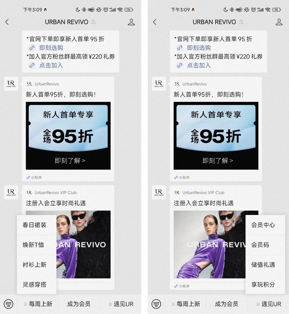路径②菜单栏:UR公众号的菜单栏针对品牌新粉、普通用户和会员用户设置了每周上新、成为会员和遇见UR三方面的利益点。最大程度引导关注公众号的用户点击进入小程序,并实现转化。