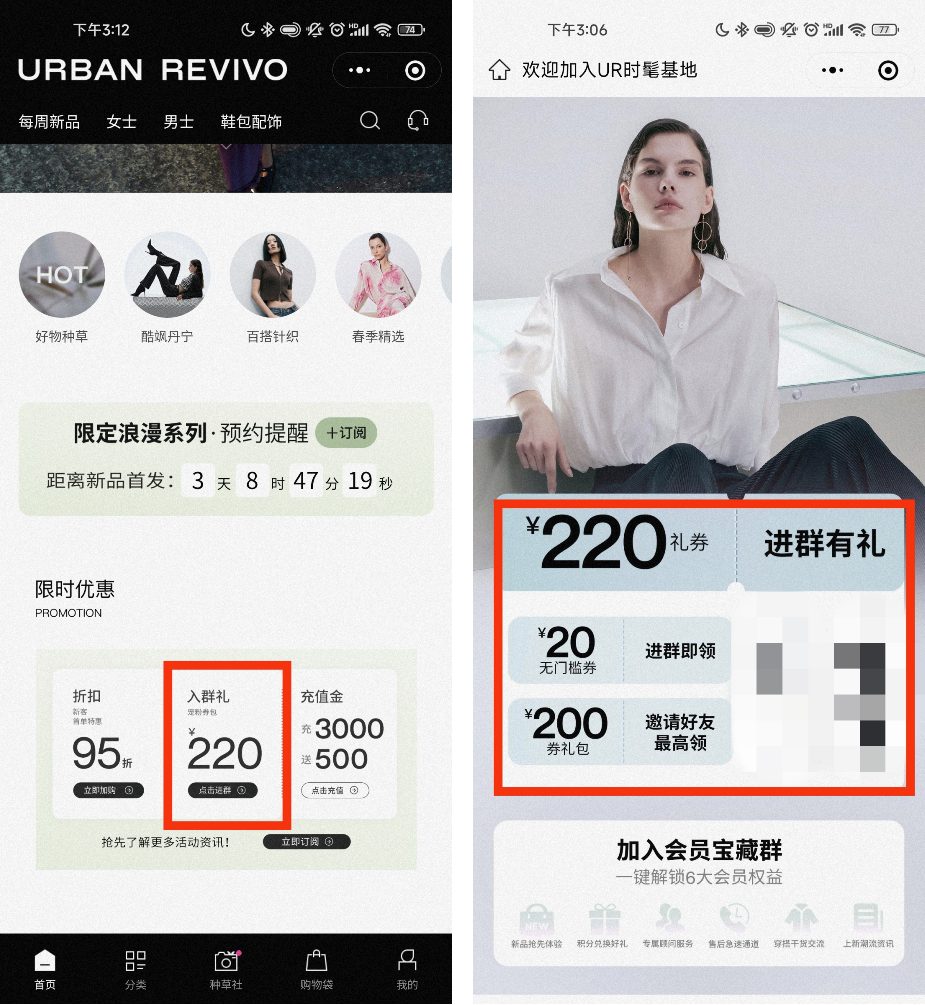 UR小程序的首页中设置了显眼的社群入口,以220元的入群礼宠粉宝吸引用户加入官方福利社群,为后续复购奠定基础。