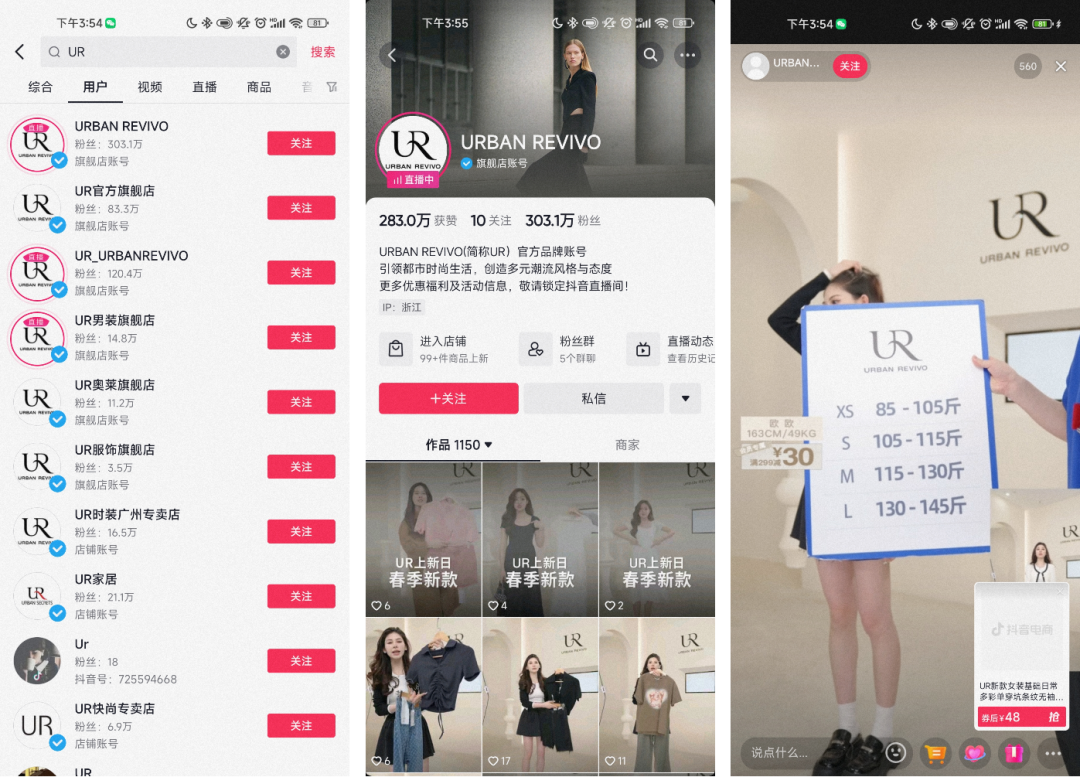 URBAN REVIVO在抖音布局了账号矩阵,主要账号粉丝累计超过500万。其中,主号有303.1万粉丝,主要视频内容包括品牌宣传、产品展示等。几个主要账号每日都会开启直播,以带货为主。