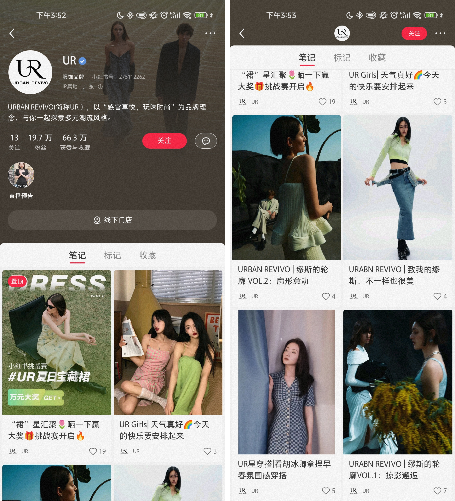 URBAN REVIVO在小红书有19.7万粉丝。笔记数量多达1800+篇,主要内容以品牌宣传、产品种草、活动介绍为主。