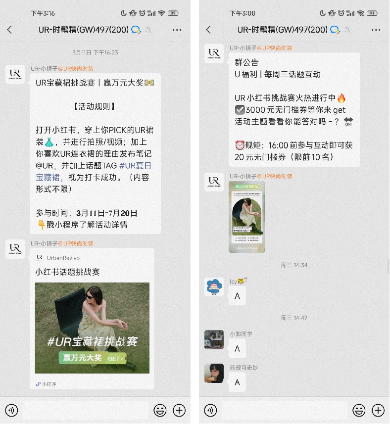 1)社群活动内容丰富:作为时尚快消类品牌,UR品类丰富,产品上新快。活动形式多,根据不同时间节点、季节来推广产品,社群较为活跃。