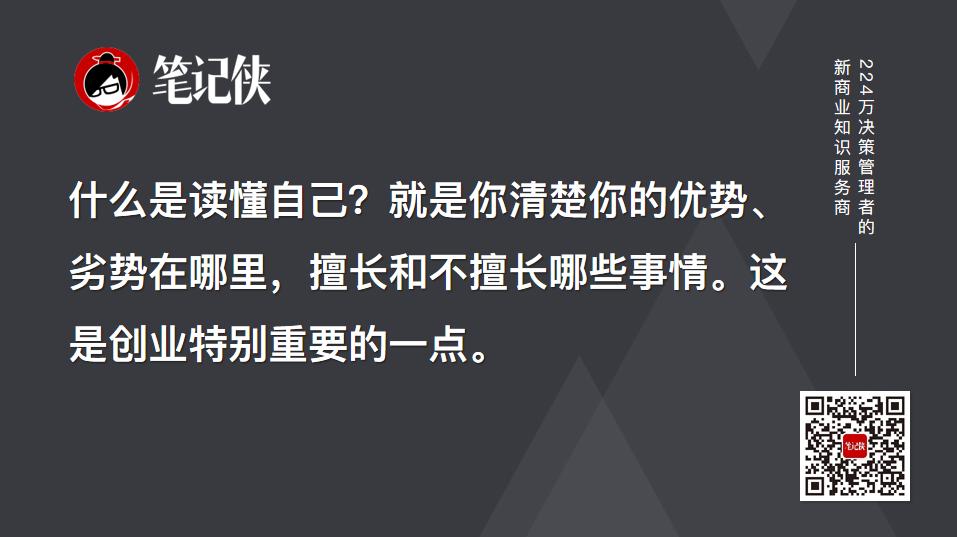 什么是读懂自己?就是你清楚你的优势、劣势在哪里,擅长和不擅长哪些事情。这是创业特别重要的一点。
