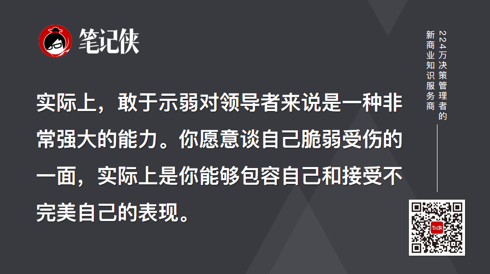 实际上,敢于示弱对领导者来说是一种非常强大的能力。你愿意谈自己脆弱受伤的一面,实际上是你能够包容自己和接受不完美自己的表现。