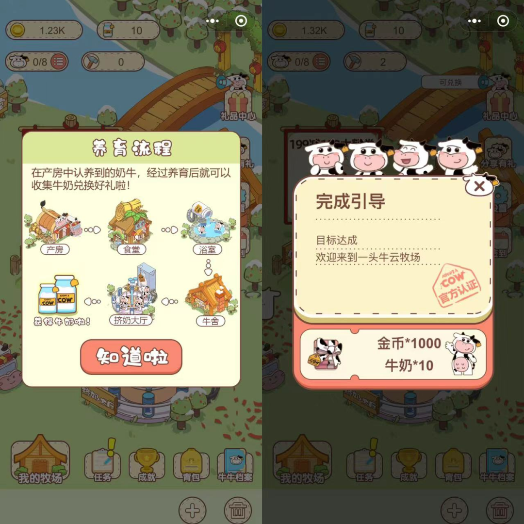 新用户参与会有每个板块的指导教程,完成之后会有金币&牛奶的奖励;看似是游戏教程,也吻合品牌牛奶生产过程,无形中可以起到普及的作用。