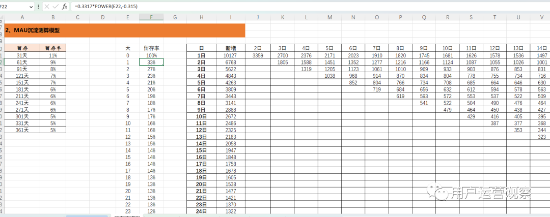 接下来要通过公式拟合30天以上的留存率,怎么操作呢?从第一天开始,留存率输入拟合函数=0.3317*POWER(E22,-0.315),这样可以得到任意N天的留存率,形成MAU沉淀的测算模型。